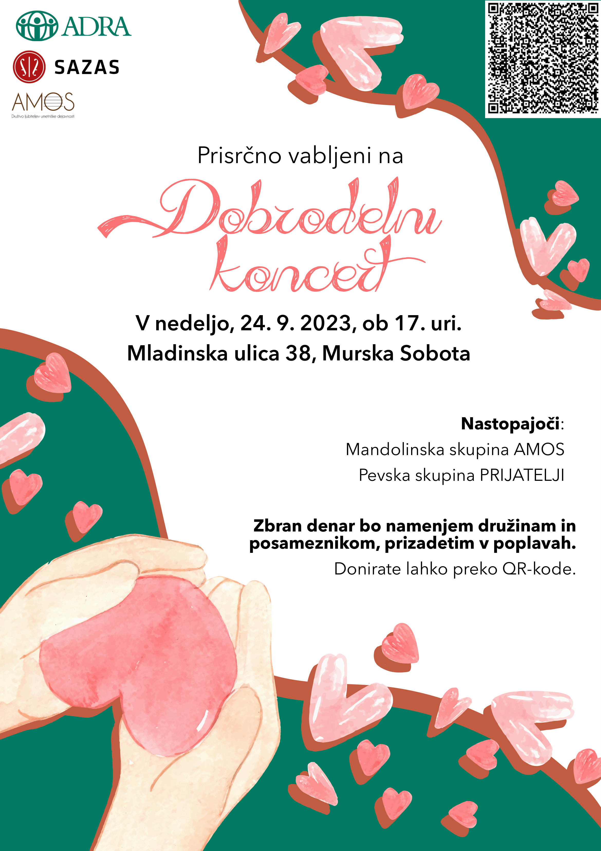 V nedeljo, 24. septembra 2023, bo od 17. ure naprej v Krščanski adventistični cerkvi v Murski Soboti potekal dobrodelni koncert mandolinske skupine AMOS in pevske skupine Prijatelji. Zbrana sredstva bodo namenjena družinam in posameznikom, ki so bili prizadeti v nedavnih katastrofalnih poplavah.