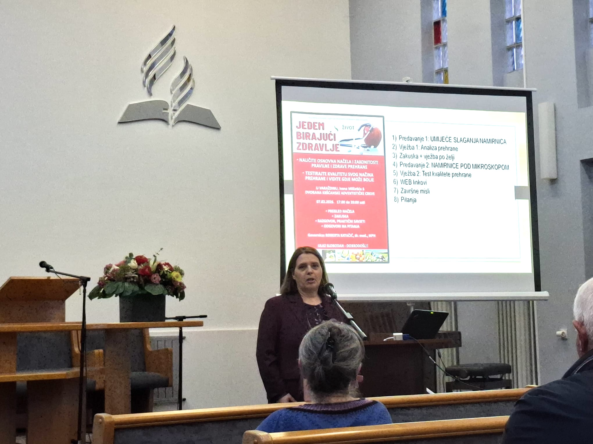 Nakon održana dva niza predavanja psihologa Nemanje Boričića, Klub zdravlja Varaždin, koji djeluje u okviru Udruge Život i zdravlje, nastavio je predavanjem dr. Roberte Katačić iz Pule, 7. veljače 2026., u Kršćanskoj adventističkoj crkvi u Varaždinu. Predavanje je bilo vrlo zanimljivo i poučno, jer je odgovorilo na pitanje kako na ispravan način birati namirnice i slagati obroke, da bi se osiguralo najbolje zdravlje. To je u današnjim uvjetima — kad su ljudi obasuti različitim prijedlozima i oprečnim savjetima — iznimno važno i potrebno. Predavanje “Jedem birajući zdravlje” poučilo je polaznike osnovnim načelima i zakonitostima pravilne i zdrave prehrane, kako da provjere kvalitetu svoje prehrane i uvide što mogu poboljšati.