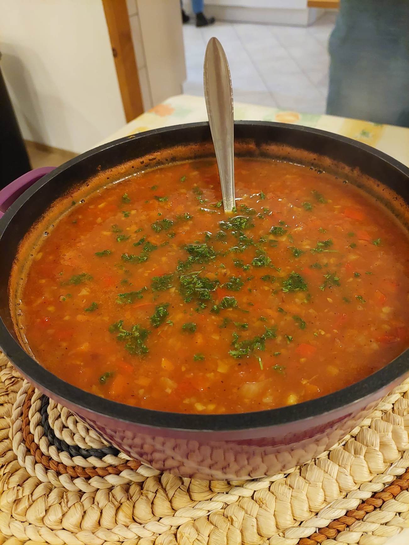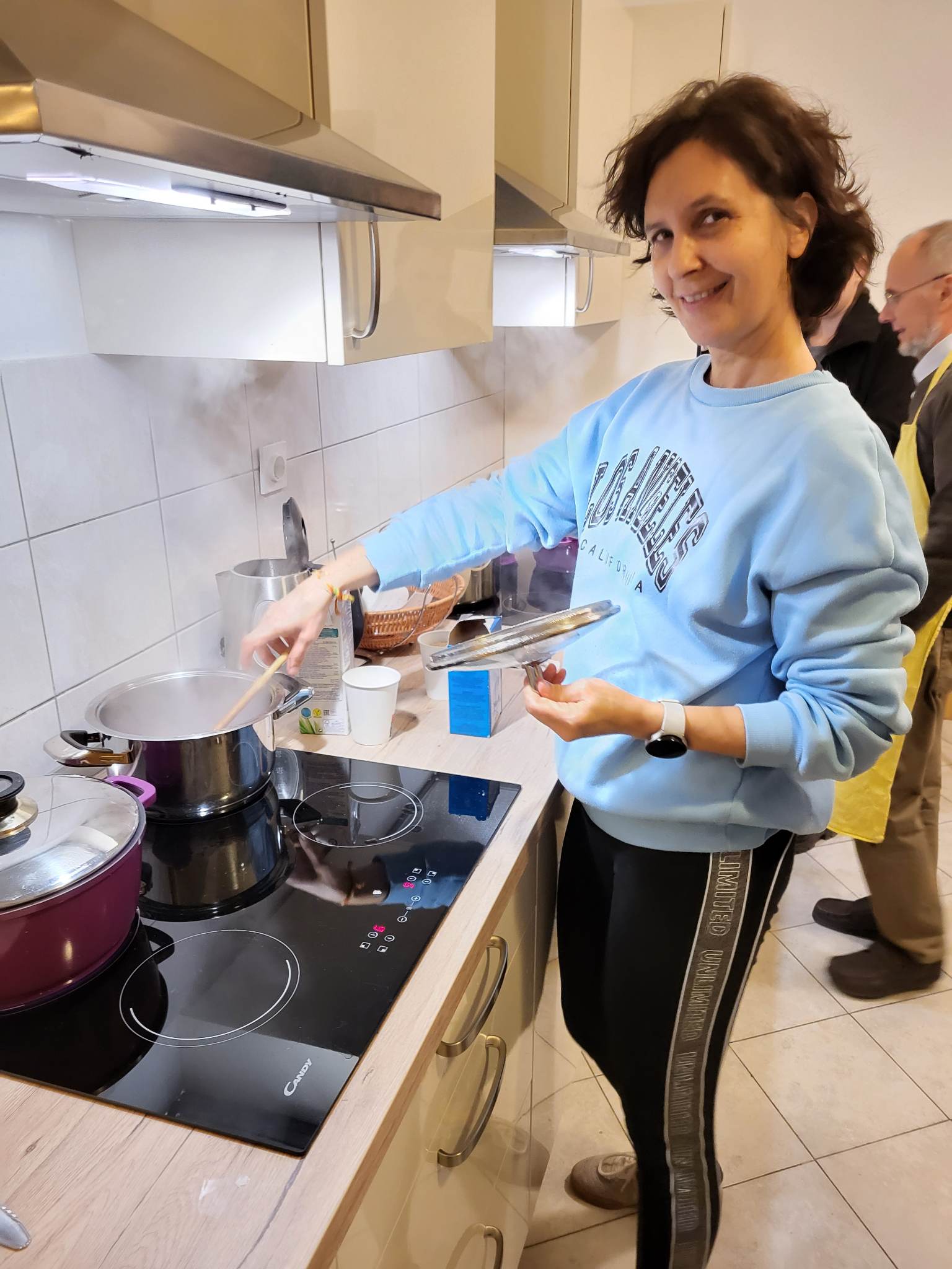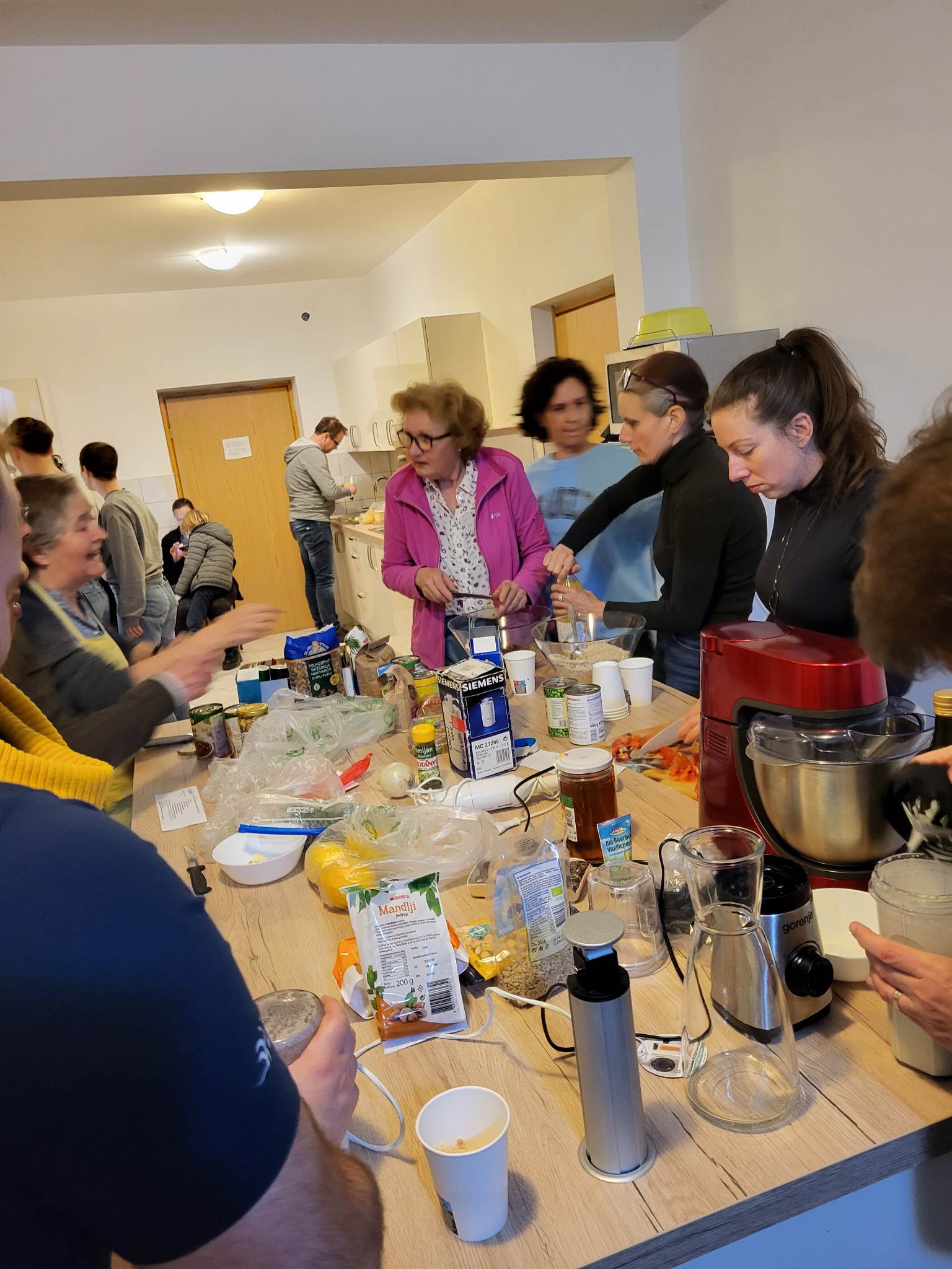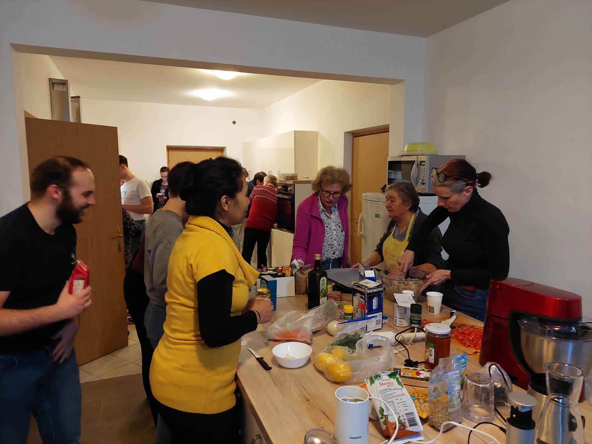 Potem so se udeleženci razdelili v skupine po 3 ali 4 in prejeli recepte. Sprva tih prostor so kmalu napolnili žvenketanje loncev, sekljanje, veseli klici iskanja pripomočkov. Razpoloženje je bilo veselo in v zraku je bilo kmalu zaznati vabljive vonjave.